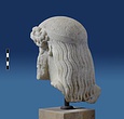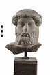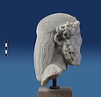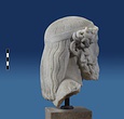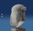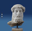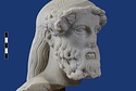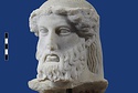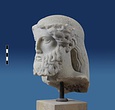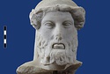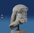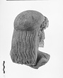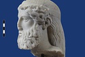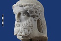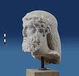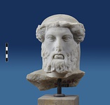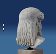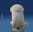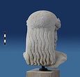 | Description: | Broken at neck, preserving part of socket of right arm. Tip of nose broken. Lower lip replaced, probably ancient repair during carving. Bearded. Long hair in waves from face and circulating from crown long in back. Stephane held with thin cord at back. Large crystal white marble. | |