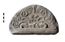 | Description: | Broken at bottom, chipped around edges. From calyx of acanthus spring four tendrils ending in spirals. Central tendril has half-palmettes. In field are three buds and two acorns. Fascia at bottom. Back roughly worked. Perhaps part of a stele or an altar. Dark Hymettian marble. | |