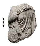 | Description: | Broken away from background. Shoulder to hips preserved of draped female figure of large Herculaneum type. Right hand holds mantle at chest. Low relief, crisp sharp folds. Roman. Pentelic marble. | |
