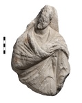 | Description: | Top of head to mid-hip preserved and small section of smoothed background plane remains to right of head male figure. Face and right side of head sheared away. Frontal standing man wrapped up in mantle with left arm down and right hand holding mantle over left shoulder. Soft thick folds carefully defined; rasped surface preserved on left hip. Hair short and combed forward, apparently a young man. Thin relief slab, rough-picked behind. Roman. Pentelic marble. | |