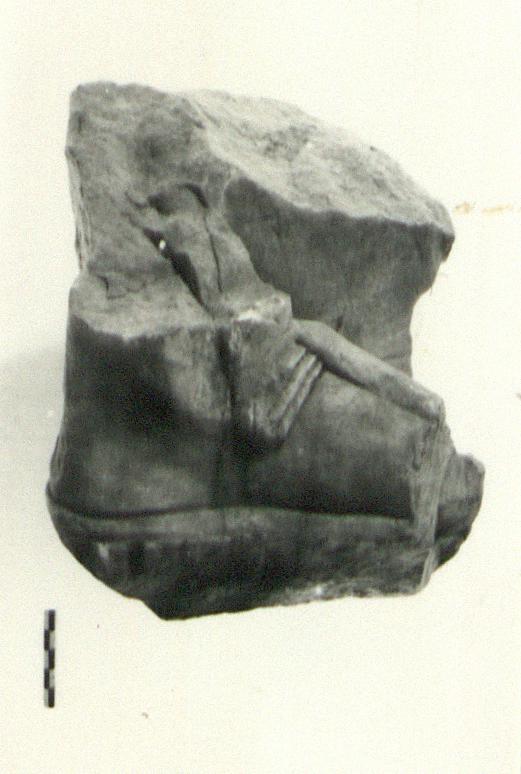 | Description: | Left foot in sandal, from just below ankle to just above toes, and right side of scroll box preserved with thick, battered plinth. Straps of sandals deeply drilled, roughly rasped heel and right side of foot. Smooth scroll box with two borders on plinth. Roman. Pentelic marble. | |