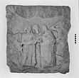 Preserved are the silhouettes of three standing females and at right a standing male (?) with his right hand on his head. At left a rough area, perhaps a rock or another figure. Molding on the left side suggests that antae and perhaps a cornice framed the relief. The women form a compact group and wear chitons and himations, which they have pulled over their heads. The male figure is slightly larger than the females - perhaps he is Apollo and the women Muses or Nymphs. The surface is very battered.