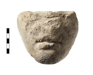 | Description: | Slice of lower half of face with nose broken off and back broken away. Oval shape of jaw line, softly modeled lips of slightly open mouth. Top surface shows hollowed area for insertion of eyes. Parian marble. | |