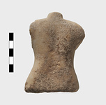| Description: | Preserves upper torso of nude or semi-draped type. Broken off at hips. Head and both arms missing; dowel holes show they were made separately. Seems to have had right hand on left breast, left hand across pubes. Parian marble. Cf. Hesperia 81 (2012), p. 338, n. 152. | |