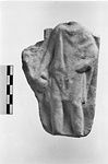 Frontal figure, broken off below neck and above ankles, wears a short chiton and chlamys. At the left a rocky projection.