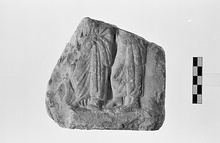 | Description: | Broken at top and left sides. Two worshippers dressed in himatia, preserved from the waist down and face left. The foot of a third and larger figure is preserved on the left. Smooth borders, one at right and one below. Pentelic marble. | |