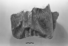 | Description: | The figure is preserved from knees to calf; the back of the block, rough-picked, is preserved, other edges broken. The drapery, its vertical folds indicated by small shallow grooves, is drawn tight across the legs to fall in a heavy mass between them. The background rough-dressed; fine toothed chisel marks prominent on the figure. White marble. | |