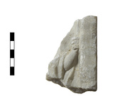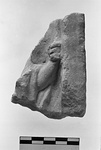 | Description: | Broken diagonally along left side, and across bottom. Back rough-picked. Preserved is the right side of a relief with a smooth border. In the relief field is a left arm, bent at the elbow and holding up a short torch or spear (?). Folds of drapery around elbow. Pentelic marble. | |