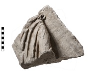 | Description: | Broken at top, bottom, and sides. Left upper arm and part of chest preserved. Cloak wrapped around upper arm and falling in folds across from left shoulder. Possibly a togatus figure. Back rough-picked. Roman. White crystalline marble. | |