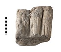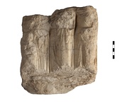 Four worshippers turned toward left where the object of their worship is broken away. The Three adult figures are preserved from above the neck to just below the knees. The first wears himation, the end of his cloak falling down over his left arm which is broken away. Alongside this figure is a much smaller figure, probably a child, but surface almost completely worn away. The second figure is the same scale as the first. The third figure is slightly smaller and completely enveloped in her himation. This is probably a servant.