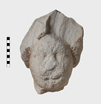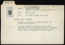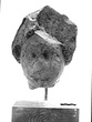 | Description: | Chopped off behind and much battered, the features nearly gone. The high coiffure is Flavian, with rows of snail-shell curls in an erection over the forehead, drill holes in the center of each curl. Round faces; traces of incised outline for pupil. Pentelic marble. Drilled for setting on base June 1950. | |