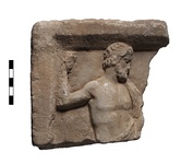 | Description: | The upper left corner of a base (?). The top is rough-picked; the left side smooth dressed. A bearded figure faces right, his body turned nearly to the front. His right arm is drawn back and up - the hand level with his head. Drapery over his left shoulder and lower body. Broken at the right and bottom, the figure lacks the left arm, and the body below the hips. White marble. | |