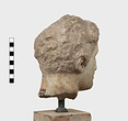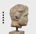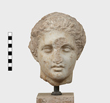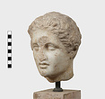 | Description: | Broken off at the neck; the nose broken, and a piece missing from the top of the head; otherwise well preserved, save for a few chips, and the remains of cement from the wall. Modern dowel hole in neck: cf. S 473. The head, slightly under life-size, is tipped slightly to the figure's right. The hair, worn in short curls brushed back from the brow, seems to have been held in place by a fillet of another material; a groove for this fillet, but no trace of metal, remains. The surface of the hair is left very rough, as if for color; the flesh is carefully polished. Although in scale and in style this head corresponds very closely to the statue S 473 (Β 571), near which it was found, there is no direct join, and the neck muscles make it seem unlikely that statue and head belong together. For a temporary union, see large photo, pl. no. 4-179. Pentelic marble. | |