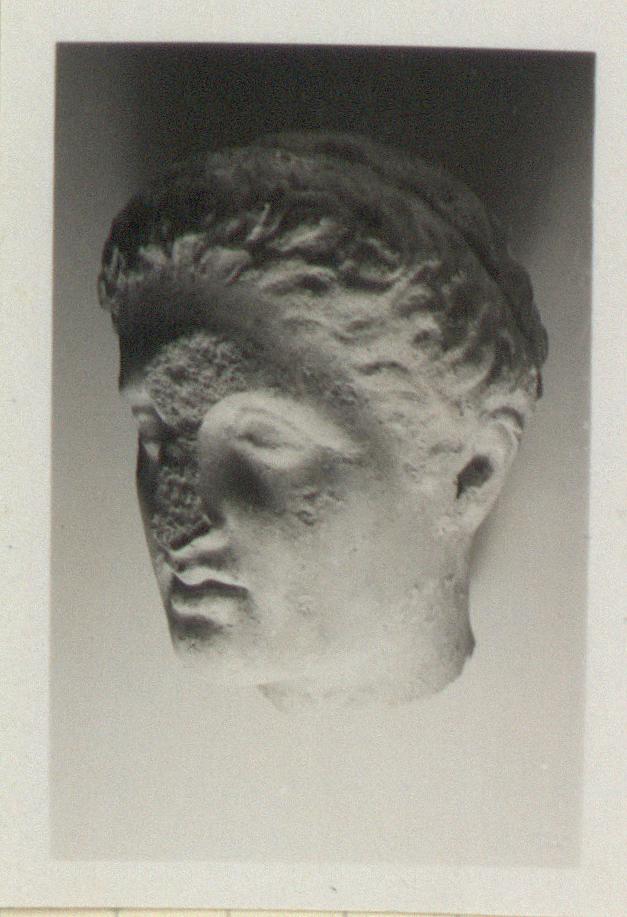 | Description: | Broken off at the neck; the nose broken, and a piece missing from the top of the head; otherwise well preserved, save for a few chips, and the remains of cement from the wall. Modern dowel hole in neck: cf. S 473. The head, slightly under life-size, is tipped slightly to the figure's right. The hair, worn in short curls brushed back from the brow, seems to have been held in place by a fillet of another material; a groove for this fillet, but no trace of metal, remains. The surface of the hair is left very rough, as if for color; the flesh is carefully polished. Although in scale and in style this head corresponds very closely to the statue S 473 (Β 571), near which it was found, there is no direct join, and the neck muscles make it seem unlikely that statue and head belong together. For a temporary union, see large photo, pl. no. 4-179. Pentelic marble. | |