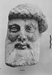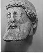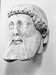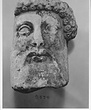 | Description: | Broken away diagonally from the back of the head to the right side of the face. The right ear and curls around the right cheek missing. The nose, left eye and end of beard chipped. Part of the neck on the left side preserved. The fine-combed hair is bound by a fillet, below which snail-shell curls frame the brow. Probably from a herm. Careful archaistic work. Pentelic marble. Joins S 1083 (Ν 179). | |