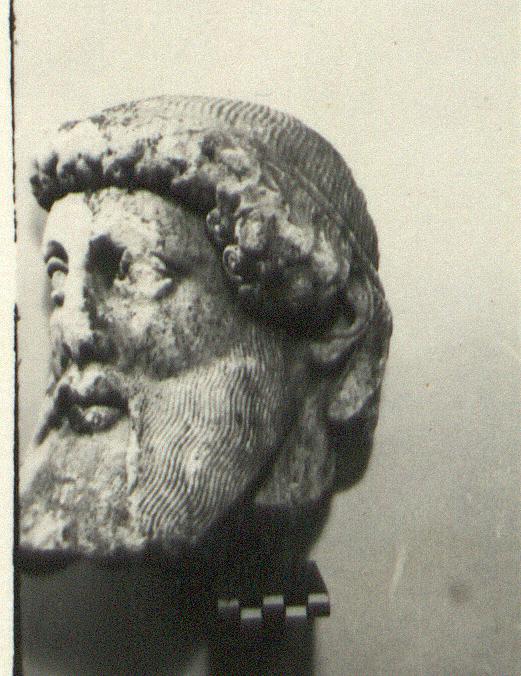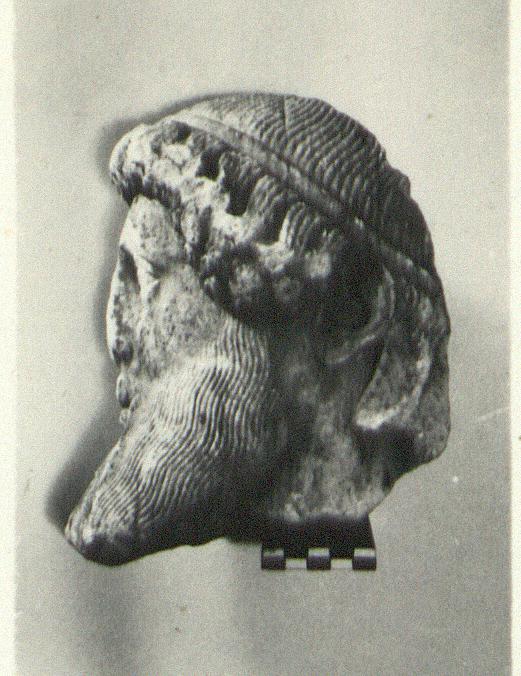 | Description: | Broken away diagonally from the back of the head to the right side of the face. The right ear and curls around the right cheek missing. The nose, left eye and end of beard chipped. Part of the neck on the left side preserved. The fine-combed hair is bound by a fillet, below which snail-shell curls frame the brow. Probably from a herm. Careful archaistic work. Pentelic marble. Joins S 1083 (Ν 179). | |