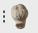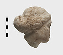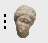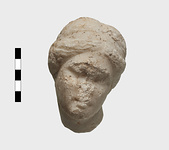 | Description: | Small head, broken away at base of neck. Face badly damaged. Hair bound by fillet, parted at center, knotted behind, Head tipped to right. "Praxitelean" type. Largish grained marble. | |
