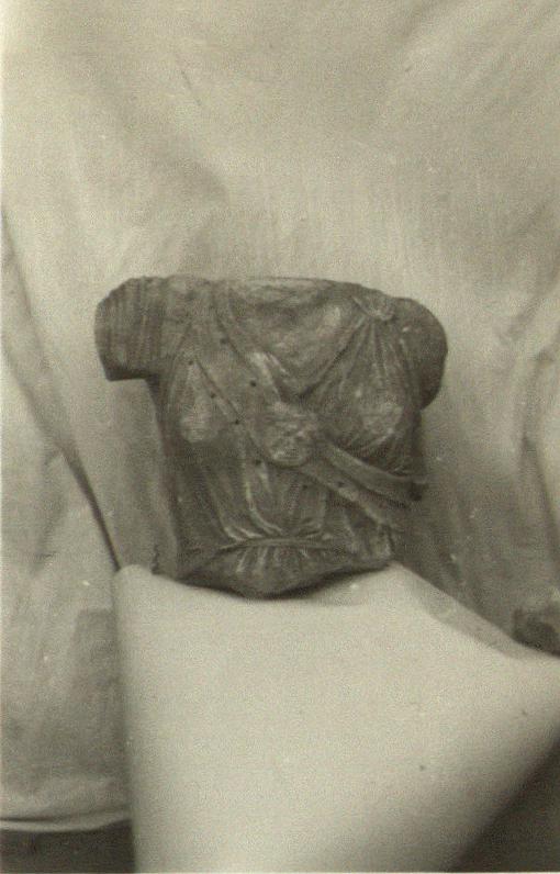 Description:   Preserved from just below the waistline to the neck; left arm broken just below the shoulder; right arm at about 0.09m. from the shoulder. Enough of both arms is preserved to show that the right arm was raised up and out to the side, and that the left was held down.
