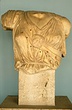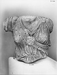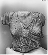 | Description: | Preserved from just below the waistline to the neck; left arm broken just below the shoulder; right arm at about 0.09m. from the shoulder. Enough of both arms is preserved to show that the right arm was raised up and out to the side, and that the left was held down. She wears a chiton gathered in about the waist with a belt of two strands. At the sides it is pulled out and hangs down over the belt. It is very sketchily shown on the back. The end of the himation, which was probably thrown around the lower part of the body, falls in heavy folds over her right shoulder. Between the shoulders are traces of hair or helmet. The gorgoneion is worn on a narrow band that crosses from the right shoulder to the left hip. On each edge of the band there is a row of small holes in which bronze snakes presumably were fastened. On top of the left shoulder there is a cutting, which must have held something (possibly an owl?). Below this cutting, on the back, is a small serpent in low relief. Pentelic marble. | |