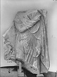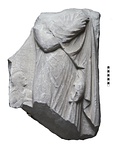 | Description: | Relief face and back only preserved, broken at top, sides and bottom. The back shows much wear, indicating use as a door sill. At the right, there is a standing draped figure, of which the head, shoulders, lower legs and feet are missing, in fairly high relief. With his right hand, he holds his himation closely around him letting the end fall in straight folds at his left side almost from the shoulder. With his left hand, he holds up several folds probably to leave the left foot free. At the right of this figure, in low relief, is a seated child with long hair, looking up at him. The background has distinct chisel marks. Pentelic marble. | |