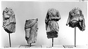 | Description: | A draped figure in high relief, preserved from waist to ankles, with part of the background. The wears a chiton girded high at her waist. Over it, around the lower part of her body, an himation, the top of which forms a heavy fold upwards to the left hip where the end was probably thrown over her left arm, and fell to the ground in heavy folds. The right leg is advanced slightly with the knee bent; the weight is on the left. Quite good cutting, but a little mechanical. Altar of Ares series. Pentelic marble. | |
