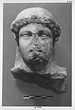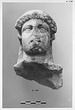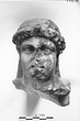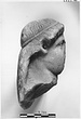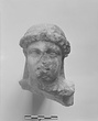 Description:   Head and very upper part of pillar preserved, including part of the rectangular cutting for left arm stub. Nose, mouth and chin damaged. Beardless, rather full face. Double row of curls across forehead, above which a fillet is bound. Hair, wavy on top, falls down behind in a broad wavy mass. Rather large hole in top of head.