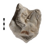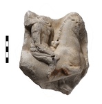 Part of a man riding a horse to right. He wears a short chiton, over it a cuirass with lappets, and a short cloak, which waves in the breeze.