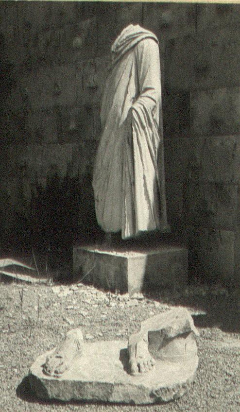 In 1965 a joining fragment was found: the feet, wearing sandals, on a plinth with a book box (scrinium) to the left side of the feet.