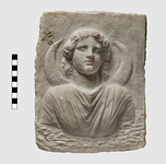 | Description: | Small rectangular plaque with roughly finished edges and back. In relief the bust and head of a draped female figure, facing. The ends of a crescent moon rise from behind her shoulders. Unfinished. The lower part of the plaque roughly dressed. Island marble. Cf. S 2344 (Ω 1550), Helios relief, and B 411 (Υ 243), Luna bronze. | |