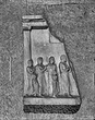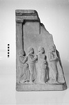 | Description: | Left side only remains. Three men, a woman, a boy and a girl, all draped, move in a procession to the right. In the wall above, a rectangular panel with the lower part of a horse's head in relief, and bordered by an anta to the left, and by an architrave and cornice above. Good work. Pentelic marble. | |