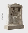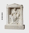 | Description: | Relief in a pedimented niche. The Mother wears a polos and is seated in a chair with a footstool; patera in right hand and tympanon in left; lion in lap. Small standing figures to her right, and to left; to left a draped woman with two long torches; to right a draped man. Pentelic marble. | |