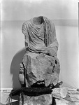 | Description: | Head missing (a separate piece set in socket); left hand, right arm from elbow, most of both legs below knees broken off; all of animal on proper left side, except wing, missing. A life-size draped male figure, left hand resting on lap, right arm stretched out or up; sitting on a throne consisting of a rectangular solid block, slightly rounded at back; front ornamented on either side with heraldic beasts (broad wings, tiger's heads with droopy tongues, rams' horns). On top of throne, in back, two rectangular dowel holes (for a back rest?), back of figure slightly dressed down. Pentelic marble. Cf. S 826 (Σ 1260). | |