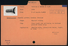 | Description: | Typical rising. Fine clay, light red yellowing to surface; pinkish cream slip. Shallow, worn impression; incomplete below, right, of rose; doubled. | |