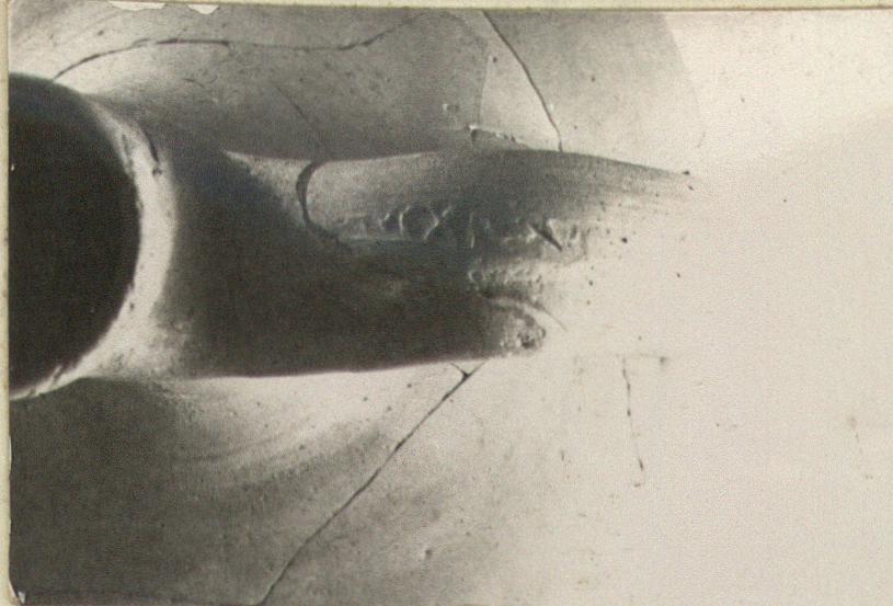 | Description: | Lagynos mended from many pieces; profile complete; ring foot, broad shoulder, rounded on the top and meeting the lower wall at an angle; tapering tall neck, with plain rolled lip; band handle from below lip to near shoulder angle. Restored in plaster. Capacity: (ground coffee, measured to [...] line just below rim) 40.80; Capacity: (water) 35.00; Capacity: (water, some leakage) 35.90. Unglazed pinkish clay; remains of light buff slip. The stamp on the top of the handle and the start of the curve. Cf. SS 10260. Cf. Agora XXXIII, no. 107. | |
