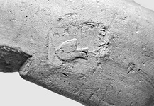 | Description: | Lightly struck stamp, rectangular, with a small head(?) right, and two letters preserved near the corner. Early Thasian. | |