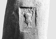 A kantharos in a rectangular stamp; faint letters beneath; also above.
