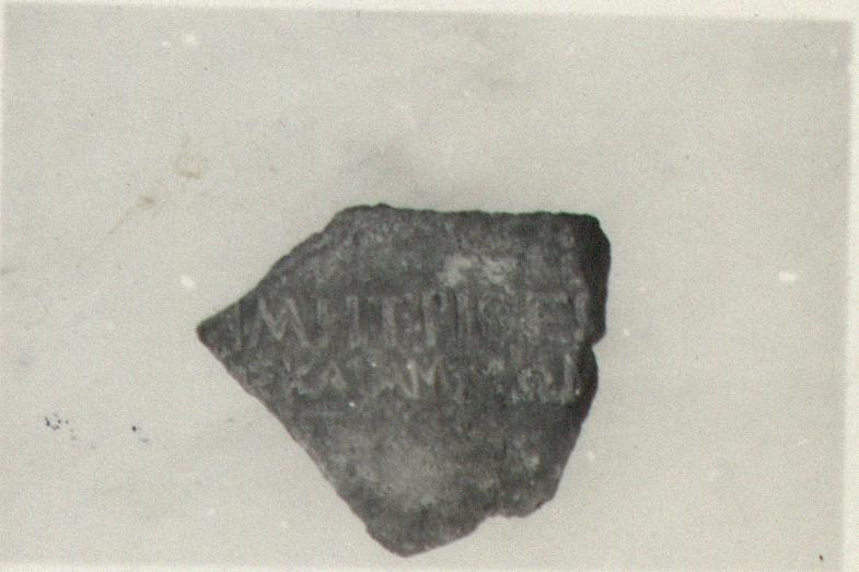 | Description: | Tile fragment. Coarse, grayish-red clay The letters impressed. Cf. A 164, A 136, and A 187 with the same inscription. | |