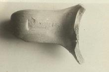 | Description: | Typical handle; marks above and bellow of fingers pressed in when the handle was still soft. Core only slightly grey. Worn impression; trident. | |