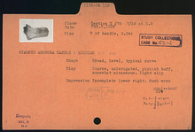| Description: | Broad, level, typical curve. Coarse clay, unlevigated, pinkish-buff, somewhat micaceous; light slip. Impression incomplete lower right; much worn. | |