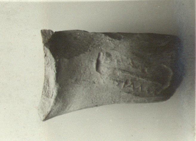 | Description: | Light color of clay. Impression set askew and rather shallow; much worn on top; upper left corner indicates a flaw in the die. | |