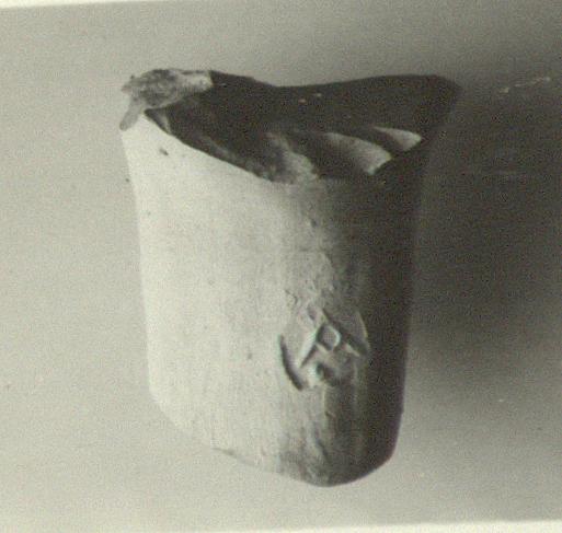 | Description: | Broadish handle, curving down close. Fairly fine clay, red near surface, buff core; thick, cream slip. Shallow impression incomplete above; fresh. | |