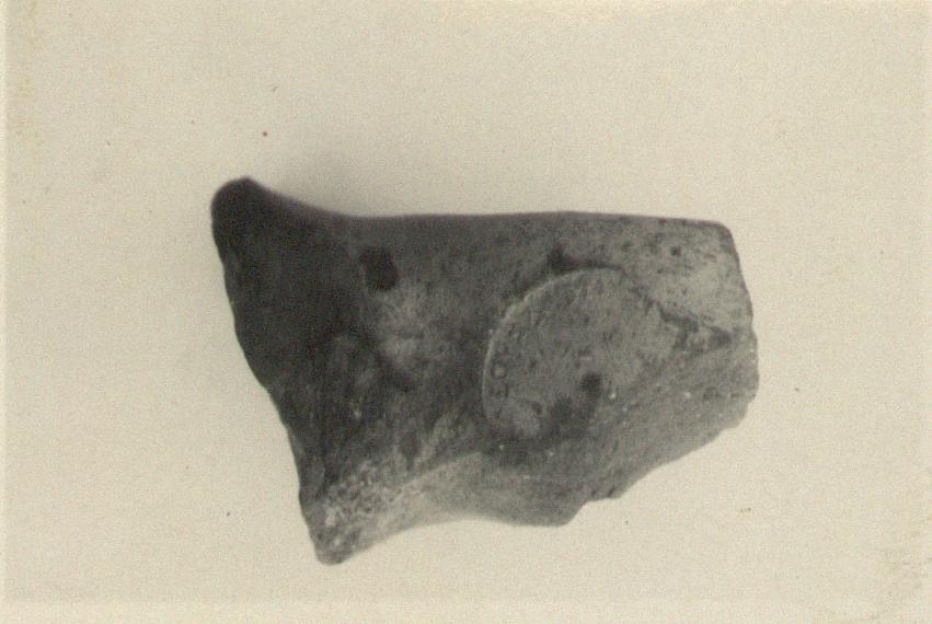 | Description: | Broad, widening to neck; broken before curve. Coarse reddish-buff clay; greyish at core; light slip; slightly micaceous. Two-thirds of the impression broken away; only traces of emblem in centre. | |
