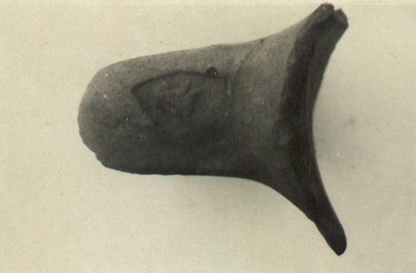 | Description: | Level, rather small; broken before curve. Coarse clay, full of bits; red, grey at core. Heart-shaped impression, with boukranion. | |