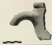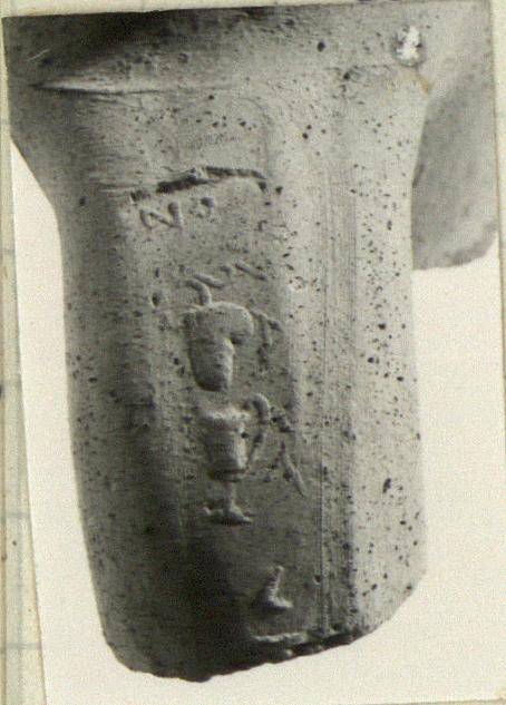 | Description: | Part of rim, neck and handle with upper attachment preserved. Clay rust-colored within with numerous black inclusions, dark buff to purple outside; very coarse. Long rectangular stamp with a bunch of grapes, a kantharos, and letters. | |