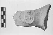 | Description: | Broken at both ends; small part of amphora preserved. Orange fabric. Boukranion surrounded by inscription. | |