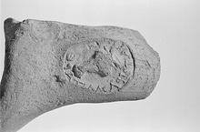 | Description: | Part of handle and adjacent shoulder preserved; edges very worn. Coarse orange fabric. Boukranion. | |