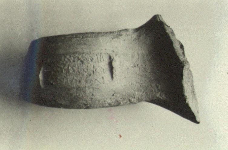 | Description: | No distinct core; slip thicker on top. Worn impression. | |