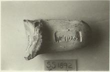 | Description: | Broadish angular(?) handle. Light red clay. Impression from very roughly made die in which the letters were gouged in the soft clay; retrograde. Cf. Nilsson (1909), p. 187; three seals of which no. 1 may be the same as this one. For the name, cf. Nilsson (1909), p. 96; near top, and no. 3. | |