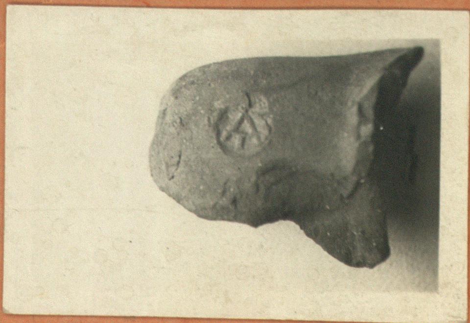 | Description: | Broad and heavy; curves close to neck. Very micaceous clay, coarse yellowish-red; light slip; traces of red at neck. Impression small, with monogram. | |