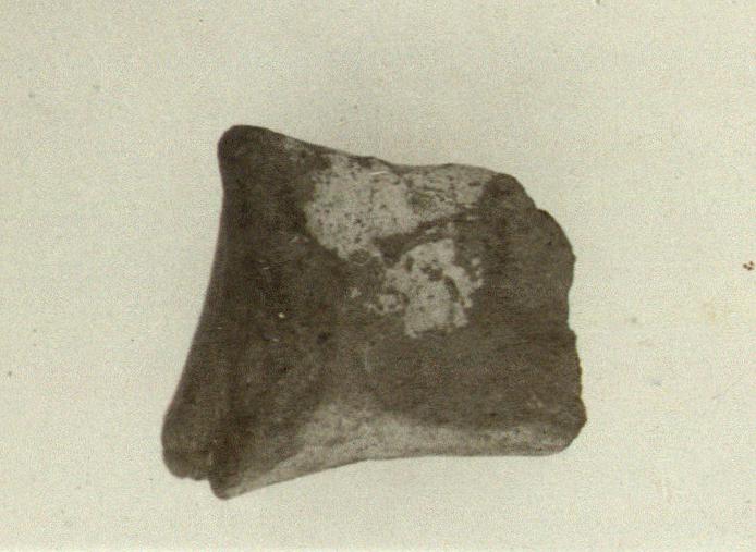 | Description: | Broad, slightly twisted, broken before curve. Coarse red clay, yellowing to surface; remains of light slip. One quarter of the impression chipped away; shallow set, nearly effaced; set close to neck. Probably from jar dated in the term of KLEUPOLIS; cf. KT 1650. | |